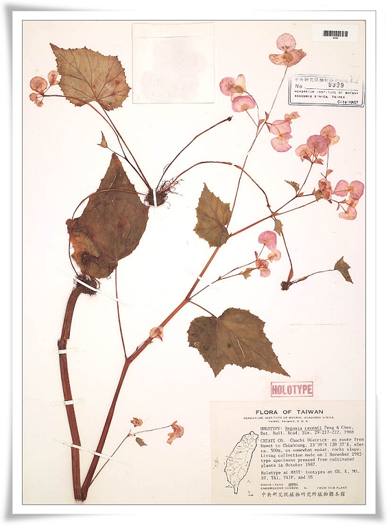 中央研究院生物多樣性研究中心植物標本館典藏近十二萬份國內外珍貴植物標本,其中以秋海棠科、菊科、蘭科及蕨類植物之標本最為豐富。本館所製作之植物標本向以精緻美觀著稱,可以充分表現植物的形態特徵、保存原有色澤,栩栩如生。經由專業數位相機拍攝數位化之後,即可永久典藏標本影像,並放置於「臺灣本土植物標本資料庫」中,供大眾透過網路遠距瀏覽。本圖為岩生秋海棠之模式標本照,模式標本在植物分類學研究上,具有不可取代之重要地位,因此格外直得珍藏。